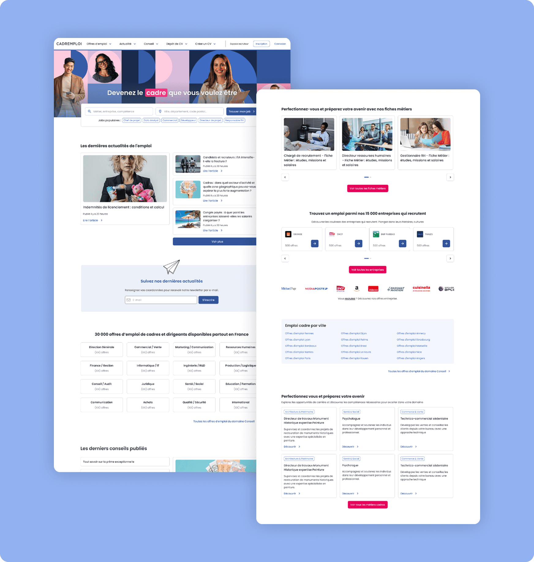 Cette refonte a ainsi permis de transformer la page d’accueil en une interface plus lisible, plus moderne et mieux structurée, capable de guider efficacement les utilisateurs dès leur arrivée sur le site tout en valorisant les contenus stratégiques de Cadremploi.