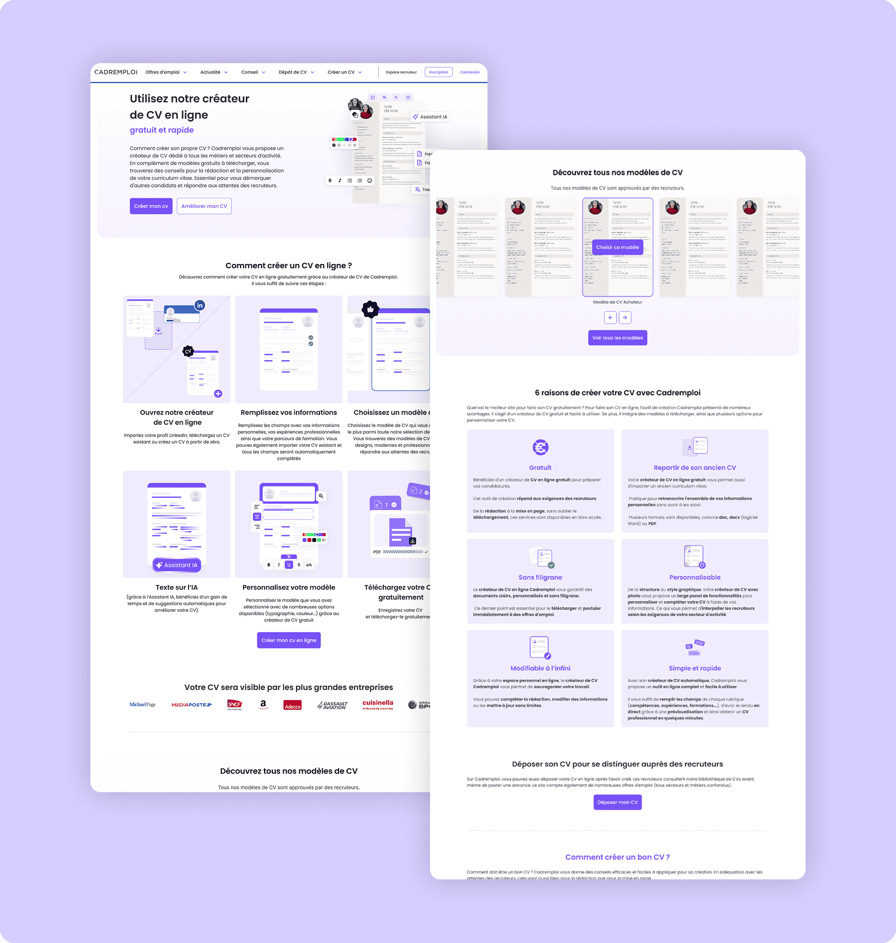 Dans le cadre de cette landing page pour le créateur de CV de Cadremploi, j’ai travaillé sur la mise en valeur de l’ensemble des services proposés aux utilisateurs, dans une logique à la fois pédagogique et orientée conversion.