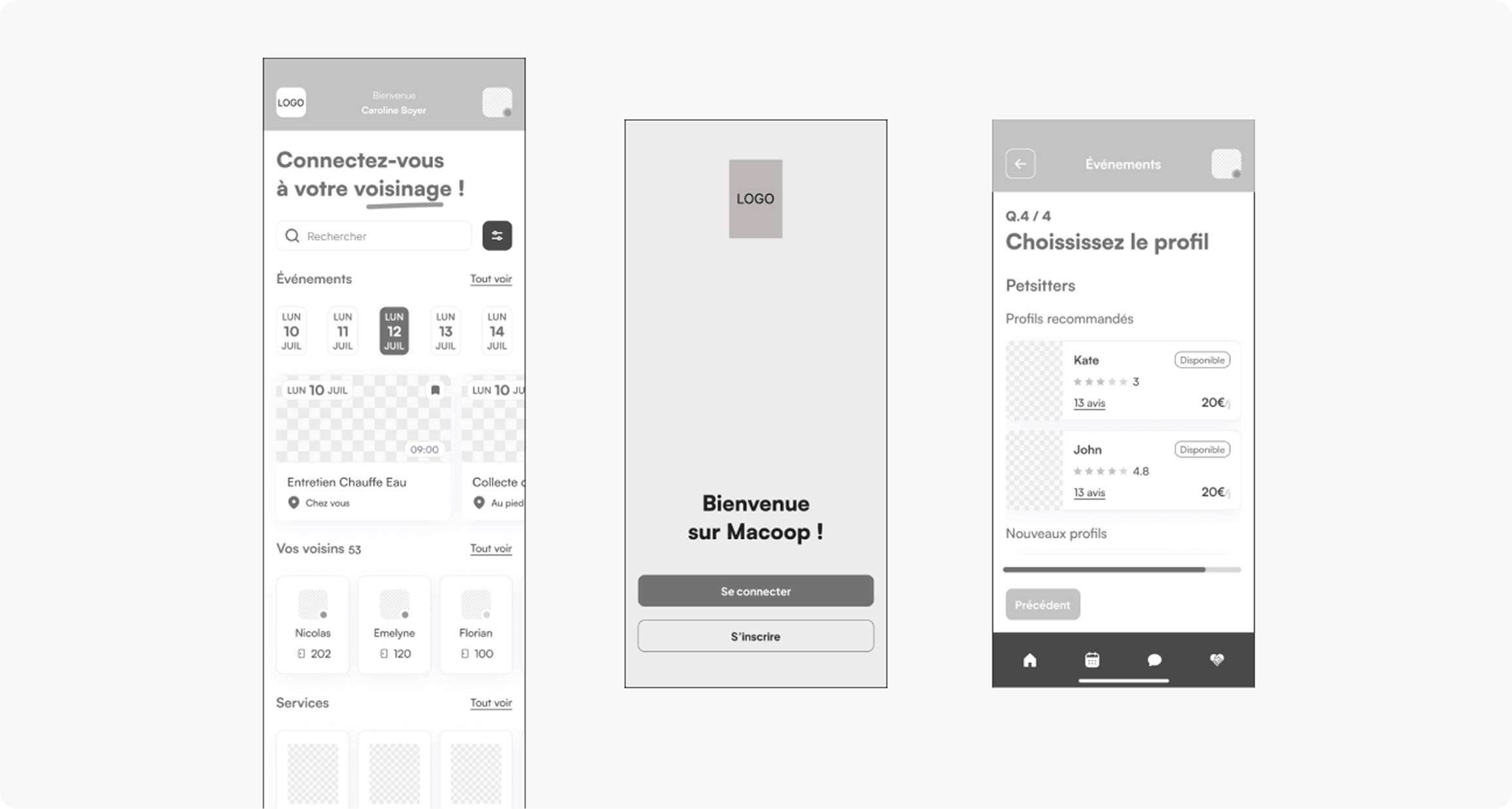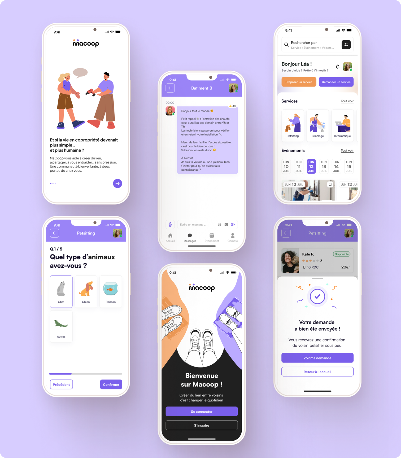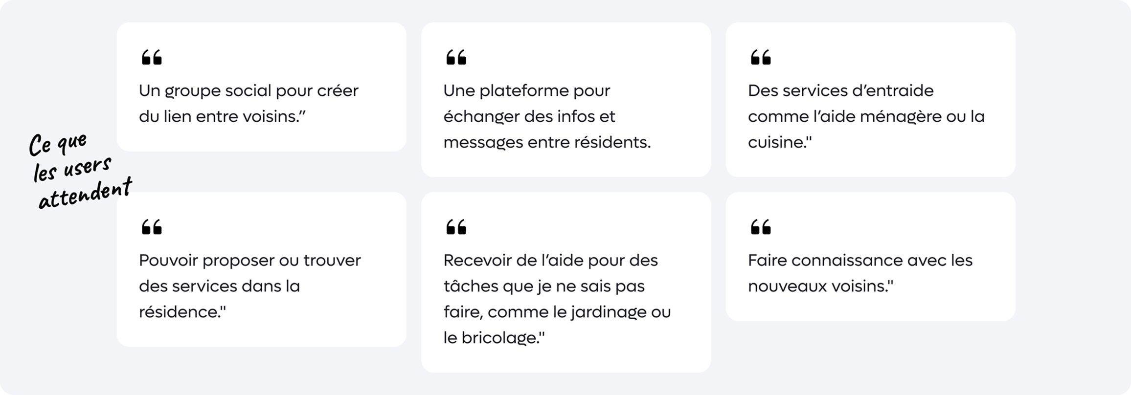 J’ai débuté par une recherche utilisateur quantitative et qualitative, en diffusant un sondage et en réalisant des interviews avec des résidents de quartiers urbains. Ces échanges ont permis de cerner les besoins concrets en matière d’entraide et de lien social entre voisins.