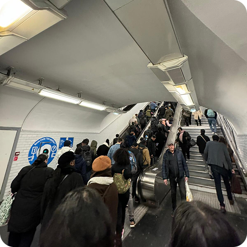 Les escalators sont fortement sollicités, entraînant une accumulation de personnes, tandis que les escaliers restent largement fluides. Cette observation met en évidence une préférence collective pour le confort plutôt que la rapidité.